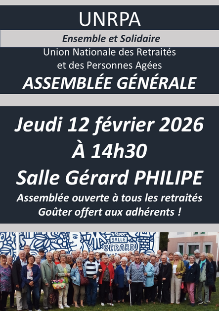 L'Union Nationale des Retraités et des Personnes Agées vous convie à son AG qui se tiendra le jeudi 12 février 2026 à la salle Gérard PHILIPE.